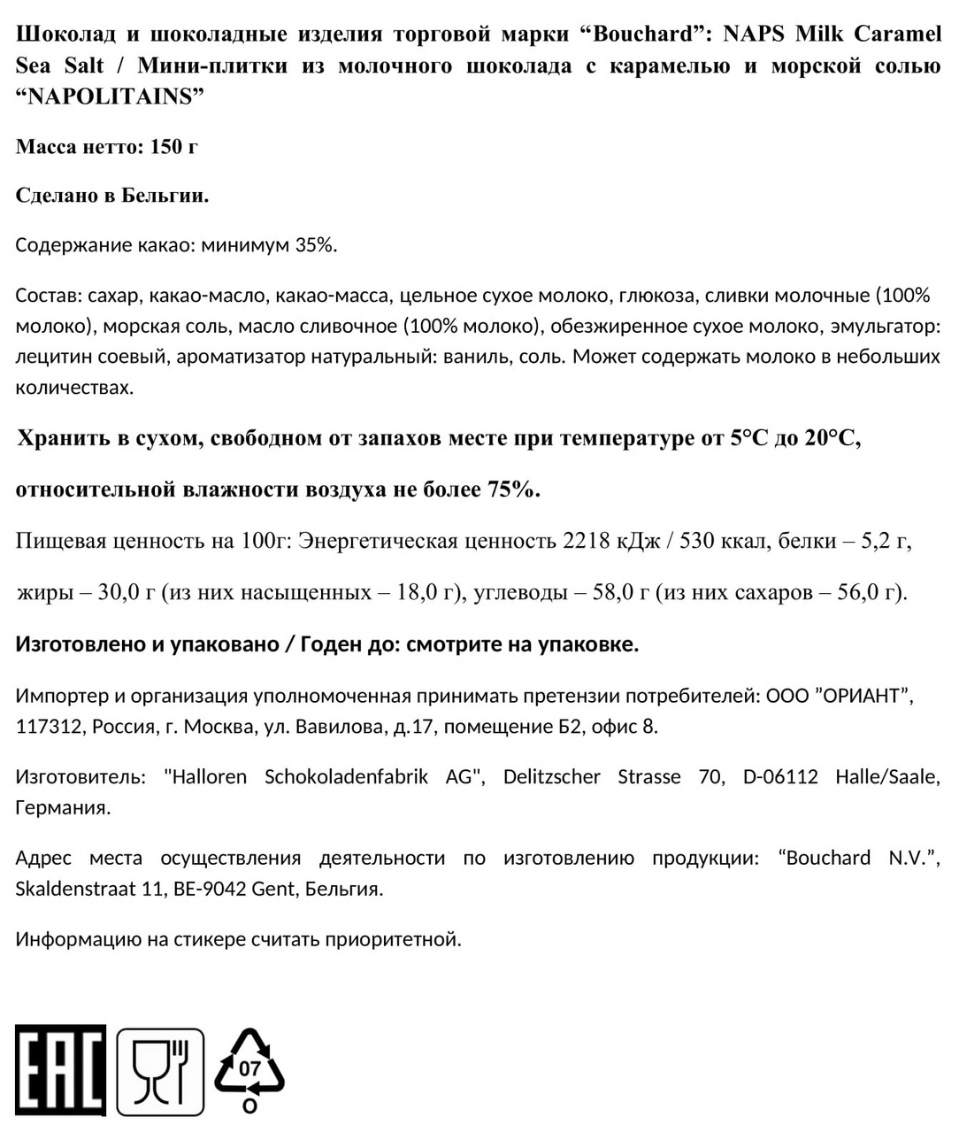Мини-шоколад Bouchard Napolitains молочный карамель и морская соль, 150г