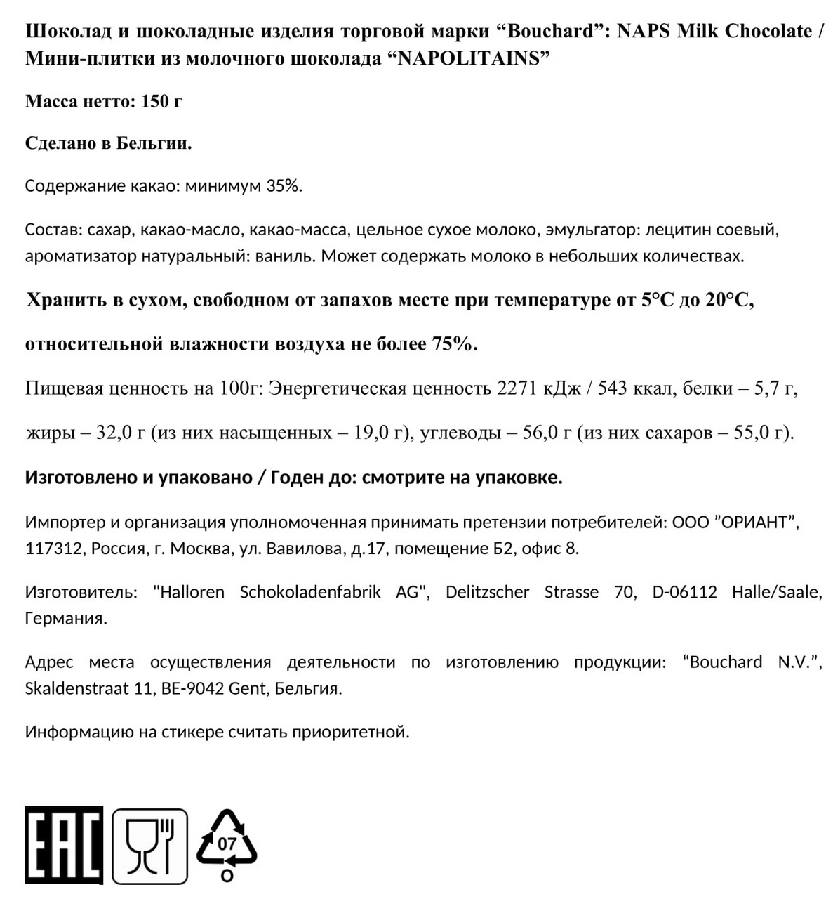 Bouchard - легендарный бельгийский шоколатье с 1896 года, чьи рецептуры удостаивались чести попадать на королевский стол. Бренд сохраняет традиции бельгийского шоколадного искусства. Bouchard одним из первых в Бельгии начал производить шоколадные изделия в форме мини-плиток, ставших визитной карточкой бренда. Нежные мини-плитки Napolitains из молочного шоколада обладают насыщенным сливочным вкусом с нотками карамели. Они изготовлены из отборных какао-бобов и натурального молока, без искусственных добавок. Каждый кусочек имеет ребристую поверхность с одной стороны - это не только элегантный дизайн, но и продуманная особенность: благодаря этим изящным бороздкам ваш язык ощущает ещё больше насыщенного вкуса премиального бельгийского шоколада. Упаковка с практичным замком zip-lock надежно сохраняет свежесть и аромат продукта, позволяя наслаждаться шоколадом постепенно. Содержание какао: минимум 35%. Такой шоколад станет изысканным угощением для себя и достойным подарком для настоящих гурманов!