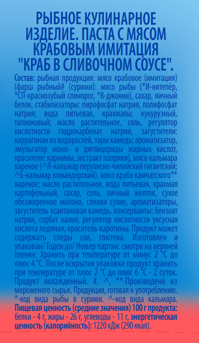 Рыбная продукция: мясо крабовое (имитация) (фарш рыбный (сурими): мясо рыбы, сахар, яичный белок, стабилизаторы: пирофосфат натрия, полифосфат натрия; вода питьевая, крахмалы: кукурузный, тапиоковый; масло растительное, соль, регулятор кислотности гидрокарбонат натрия, загустители: каррагинан из водорослей, тары камедь; ароматизатор, эмульгатор моно- и диглицериды жирных кислот, красители: кармины, экстракт паприки), мясо кальмара вареное (Л-кальмар перуанско-чилийский гигантский; Б-кальмар командорский), мясо краба камчатского вареное; масло растительное, вода питьевая, крахмал картофельный, сахар, соль, яичный желток, сухое обезжиренное молоко, сливки сухие, ароматизаторы, загуститель ксантановая камедь, консерванты: бензоат натрия, сорбат калия; регулятор кислотности уксусная кислота ледяная, краситель каротины. Продукт может содержать следы сои, глютена.