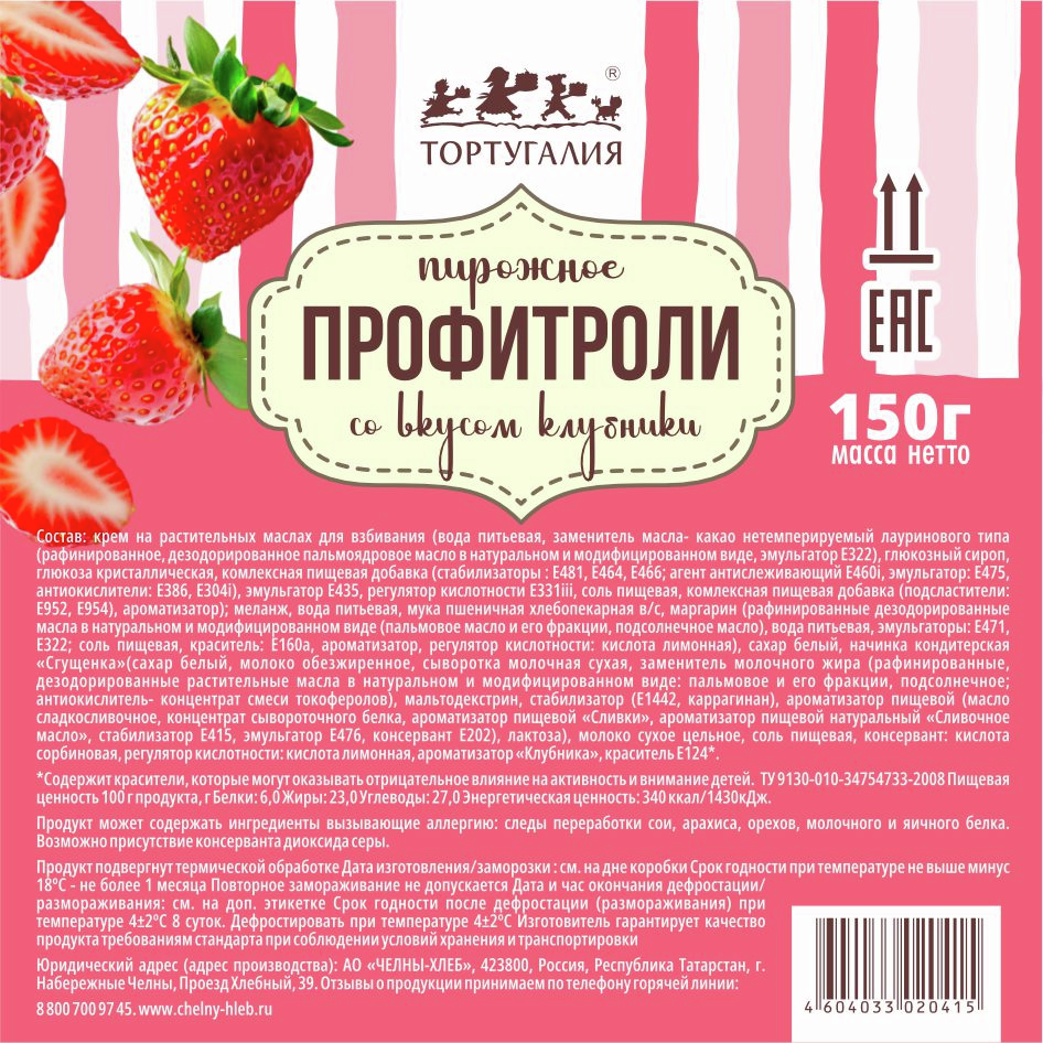 Изделие состоит из заварного п/ф неправильно круглой формы, начиненных кремом на основе растительных сливок со вкусом клубники. Готовится по традиционному рецепту из нежного тающего теста с добавлением клубники. Нежные заварные профитроли идеально подходит для семейного чаепития и праздничного стола.
