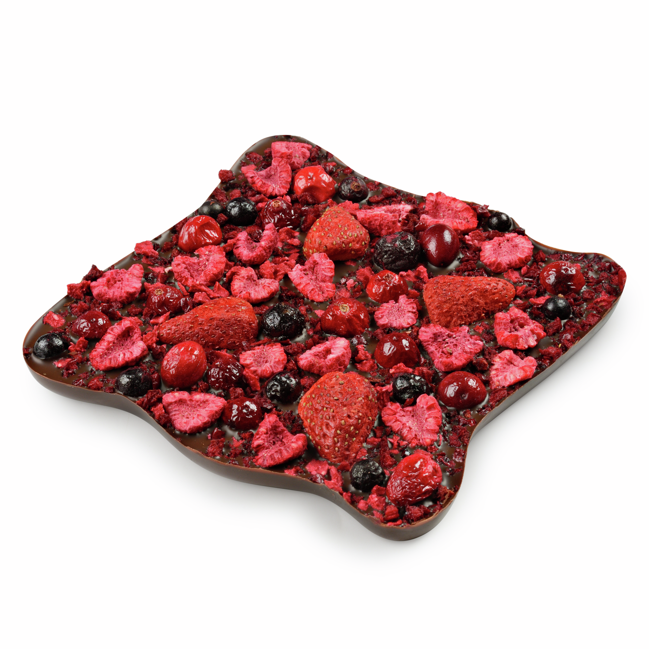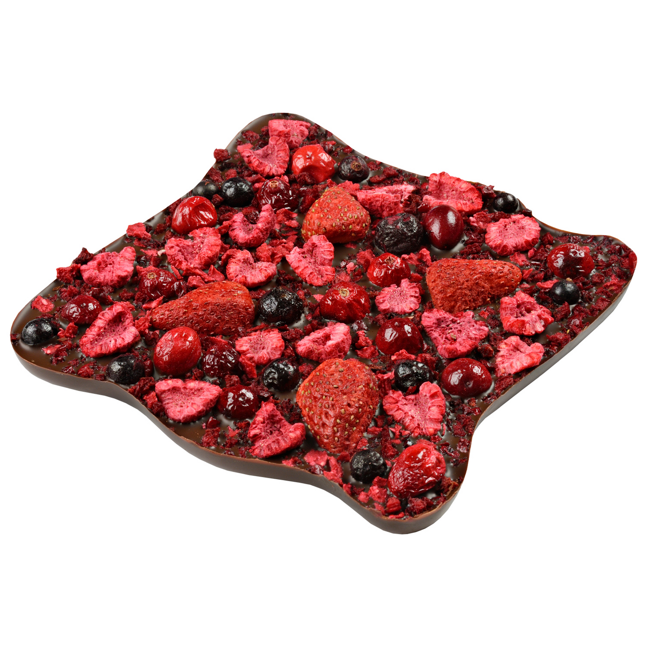 Темный шоколад какао тертое, сахар, масло какао, эмульгатор: соевый лецитин, натуральный ароматизатор ванильный, ягоды сушеные вишня, малина, черника, клюква, клубника.
