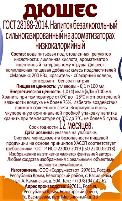 Напиток безалкогольный сильногазированный на ароматизаторах низкокалорийный без сахара. Превосходный десертный вкус: винно-сладкий, с приятной кислинкой и мускатным ароматом. Дюшес ‒ один из изысканных, старых европейских сортов груш был назван в честь герцогини Франции.