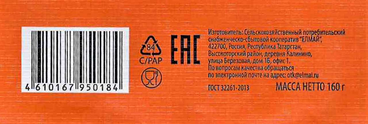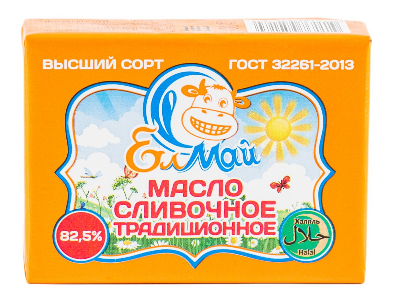 Масло сливочное изготовлено из пастеризованных сливок по ГОСТ на предприятии имеющем замкнутый цикл производства, без применения растительных и животных жиров. Елмай в переводе улыбнись, этот продукт создан дарить Вам радость. Содержание жира 82,5%. Это воплощение старинных традиций и современных технологий. Его изготавливают из высококачественных сливок. Имеет превосходный вкус и нежный сливочный аромат. Используется для приготовления бутербродов, слоеного и песочного теста, кондитерского крема, добавляется в каши и другие блюда.