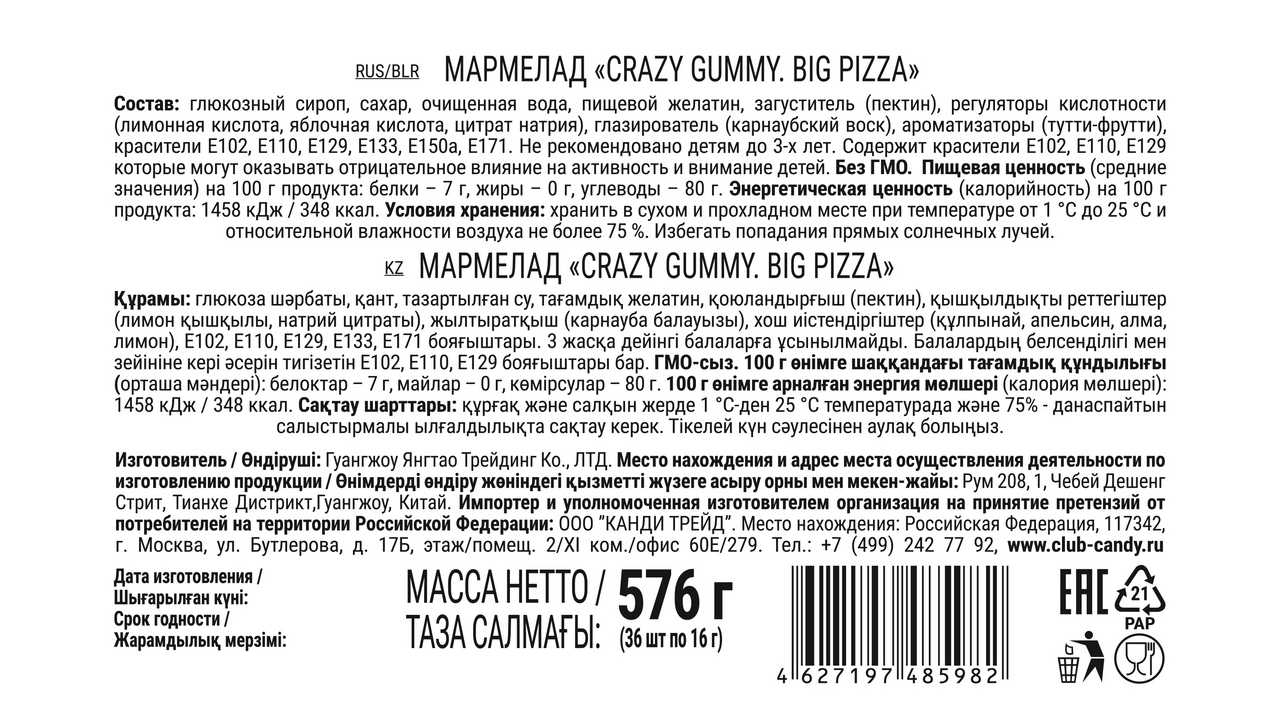 Мармелад Канди клаб Crazy Gummy Big Pizza, 16г x 36 шт - мармелад в форме пиццы: одна из популярных сладостей и оригинальных угощений. Этот мармелад - настоящее воплощение вкуса и креативности. В каждой упаковке вы найдете мармелад, выполненный в форме круглой пиццы. Он имеет различные начинки, напоминающие традиционные ингредиенты для пиццы: сыр, колбаса, помидоры и так далее. Мармелад выполнен в сочных ярких цветах, что делает его еще более привлекательным и аппетитным. Мягкая и сочная консистенция, а также нежный, сливочный, кисло-сладкий вкус покорят вас, в то время как узнаваемые ягодные и фруктовые нотки напомнят о детских беззаботных порах. Мармеладные фигурки забавно смотрятся в качестве украшения на торте, пирожном десерте, за что их очень любят кондитеры, сладостями можно украсить кэнди бар.