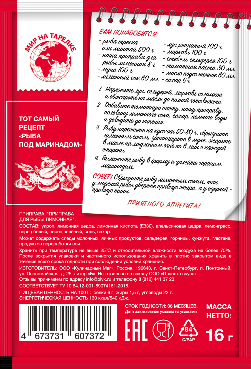 Приправа Рыбалка в Териберке - это идеальное дополнение к вашему любимому рыбному блюду. Смесь приправ, специй и трав и лимона от бренда Мир на Тарелке подарит вам возможность экспериментировать с разными вариантами рыбных блюд. Вы сможете приготовить рыбу под маринадом, запеченную в духовке или гриле, а также использовать приправу для приготовления соусов и заправок к блюдам из рыбы.