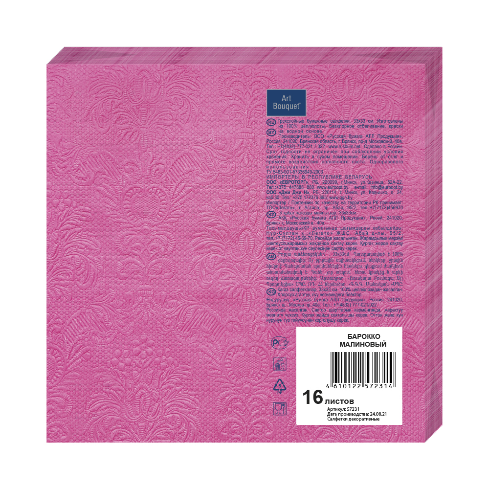 Салфетка Bouquet малиновый барокко 3 слоя, 16шт – один из обязательных атрибутов сервировки стола. Они выполняют практическую и эстетическую функции, служат украшением и не позволяют испачкать руки или одежду во время приема пищи.