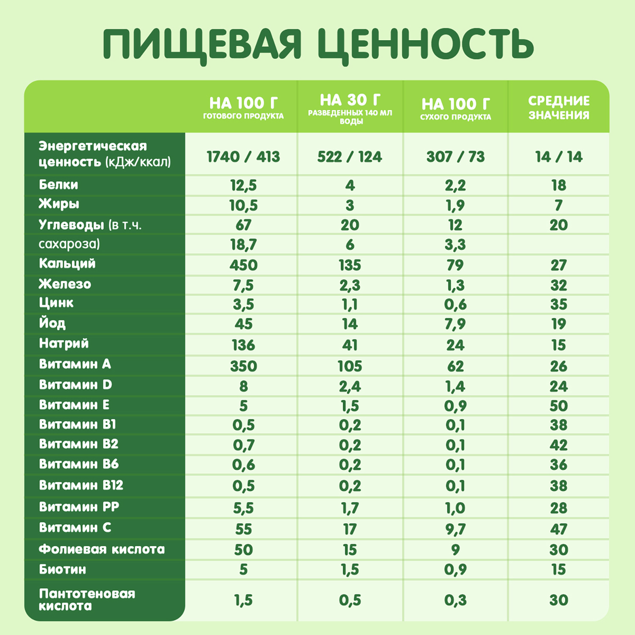 Мука пшеничная, кукурузная и овсяная, сухое обезжиренное молоко, сахар, пюре вишни, масло подсолнечное высокоолеиновое, витамины (С, РР, Е, пантотеновая кислота, В6, В2, В1, А, фолиевая кислота, D3, биотин, В12), минеральные вещества кальций, железо, цинк, йод.