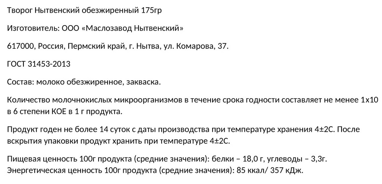 Творог Маслозавод Нытвенский обезжиренный, 175г