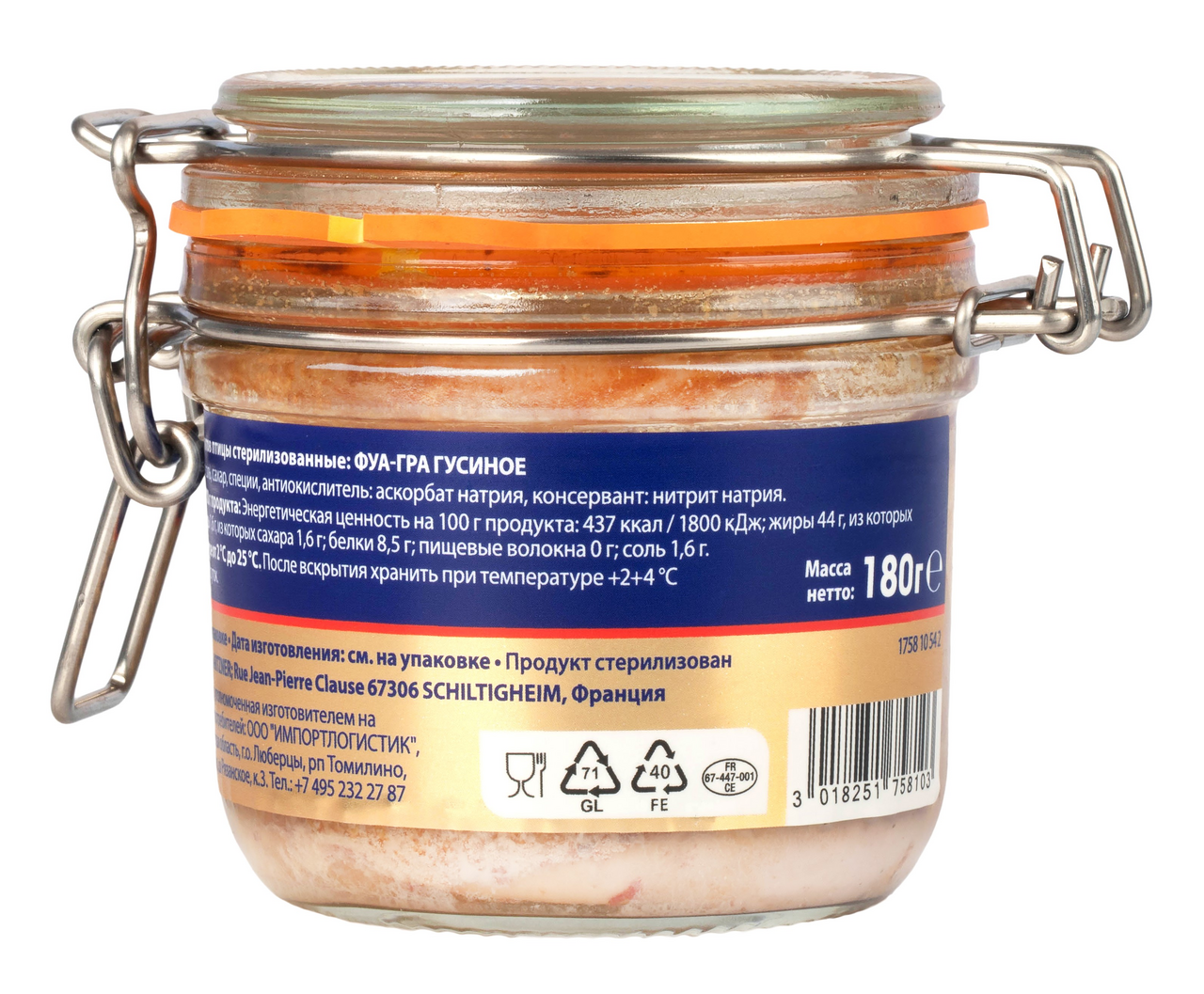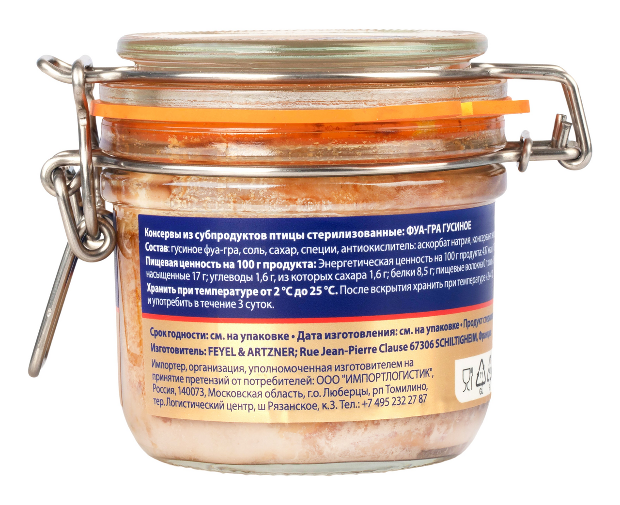 Гусиное фуа-гра, соль, сахар, специи, антиокислитель: аскорбат натрия, консервант: нитрит натрия.