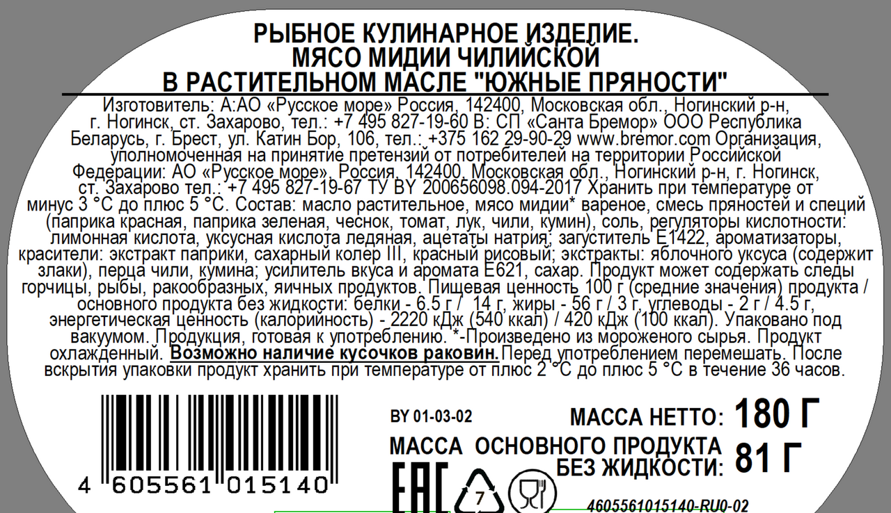 Масло растительное, мясо мидии вареное, смесь пряностей и специй (паприка красная, паприка зеленая, чеснок, томат, лук, чили, кумин), соль, регуляторы кислотности: лимонная кислота, уксусная кислота ледяная, ацетаты натрия; загуститель Е1422, ароматизаторы, красители: экстракт паприки, сахарный колер III, красный рисовый; экстракты: яблочного уксуса (содержит злаки), перца чили, кумина; усилитель вкуса и аромата Е621, сахар. Продукт может содержать следы горчицы, рыбы, ракообразных, яичных продуктов.