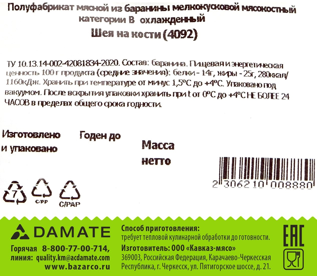 Шея молодого барашка Bazarco Халяль на кости охлажденная, ~1кг