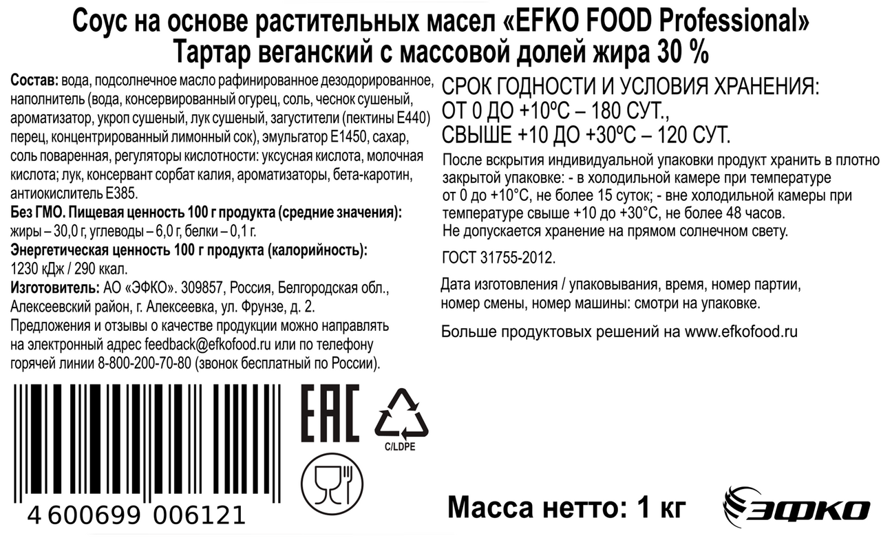 Соус Efko Food Professional Тартар Веган ГОСТ 30%, 1кг