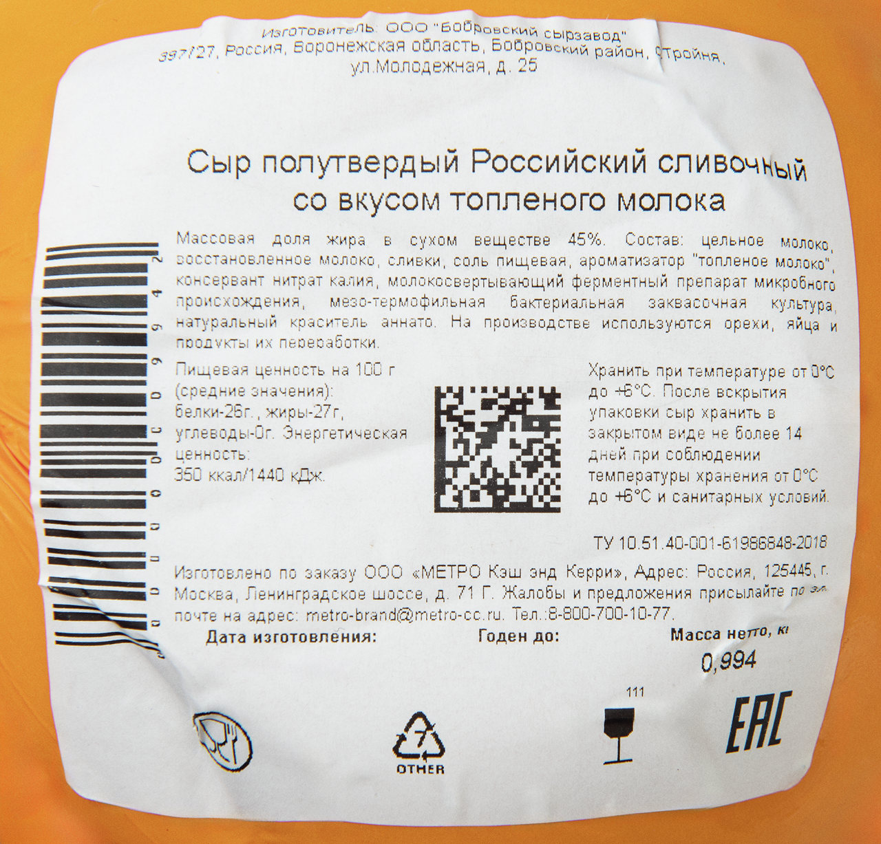 Цельное молоко, восстановленное молоко, сливки, соль пищевая, консервант-нитрат натрия, молокосвертывающий ферментный препарат микробного происхождения, мезо-термофильная бактериальная заквасочная культура, натуральный краситель – аннато, ароматизатор топлёное молоко.