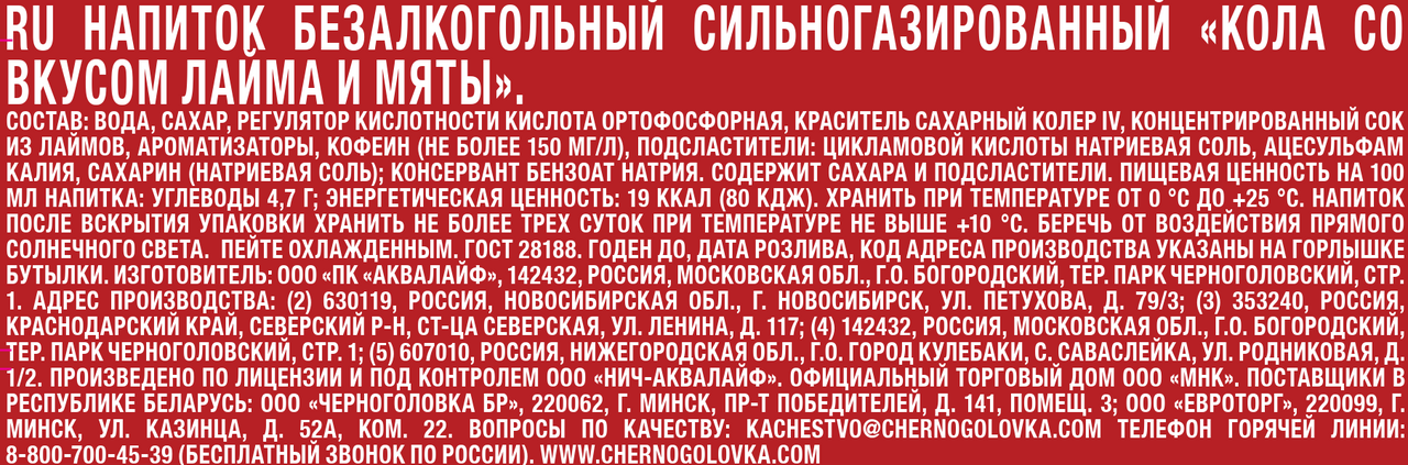 Напиток Черноголовка Кола лайм и мята, 1л x 12 шт - вкус классической колы в идеальном сочетании с экзотическим лаймом и прохладой душистой мяты. Идеально подходит тем, кто хочет утолить жажду и насладиться колой с необычным и освежающим вкусом. Лимонад, сочетающий вкус классической колы, экзотического лайма и прохладной душистой мяты. Прекрасно подходит тем, кто хочет утолить жажду и насладиться колой с необычным и освежающим вкусом. Напиток прекрасно утолит жажду в знойную погоду и подарит глоток летней свежести зимой. Рекомендуется пить охлажденным.