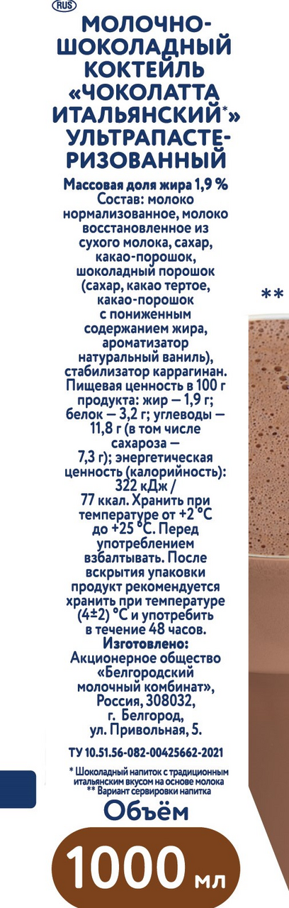 Нормализованное молоко, восстановленное молоко, сахар, какао-порошок, шоколадный порошок: сахар, какао тертое, какао-порошок с пониженным содержанием жира, ароматизатор натуральный ваниль, стабилизатор каррагинан.