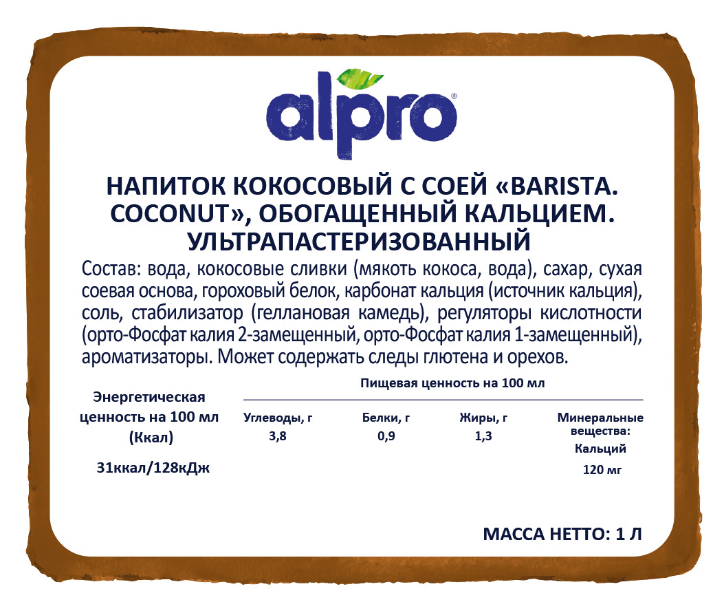 Кокосовый Alpro Barista разработан специально для профессиональных бариста и истинных кофеманов. Он легко взбивается в устойчивую воздушную пенку и прекрасно подходит для латте-арта. В его основе натуральные кокосовые сливки из солнечного Тайланда, благодаря чему напиток обладает нежным вкусом и ароматом. Отлично сочетается с любыми сортами кофе и станет твоим лучшим другом в любых кофейных экспериментах.
