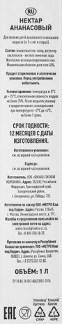 Ананасовый сок, сахар, регулятор кислотности - лимонная кислота, вода. Изготовлен из концентрированного сока. Минимальная обьемная доля сока 40%.