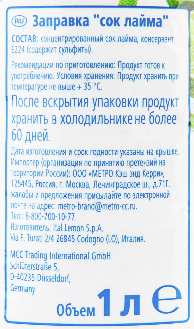 Концентрированный сок лайма, консервант Е224 (содержит сульфиты).