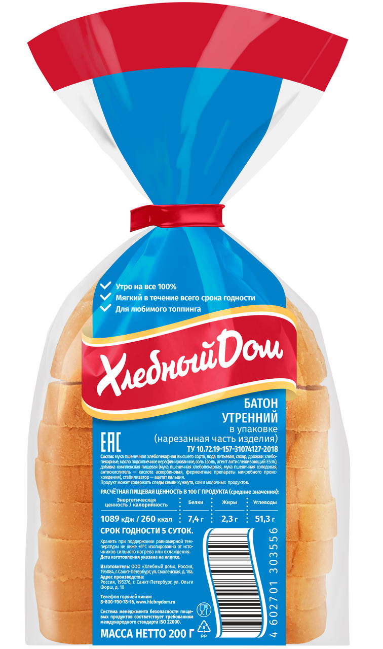 Ароматный продукт с нежным вкусом. Без пальмового масла, усилителей вкуса, ароматизаторов и красителей. Хлеб легкий, вкусный с хрустящей корочкой. Продукт без крупных трещин и подрывов. Ароматный батон подходит для приготовления бутербродов и отлично сочетается с супами, мясными и рыбными блюдами, а также сливочным маслом.