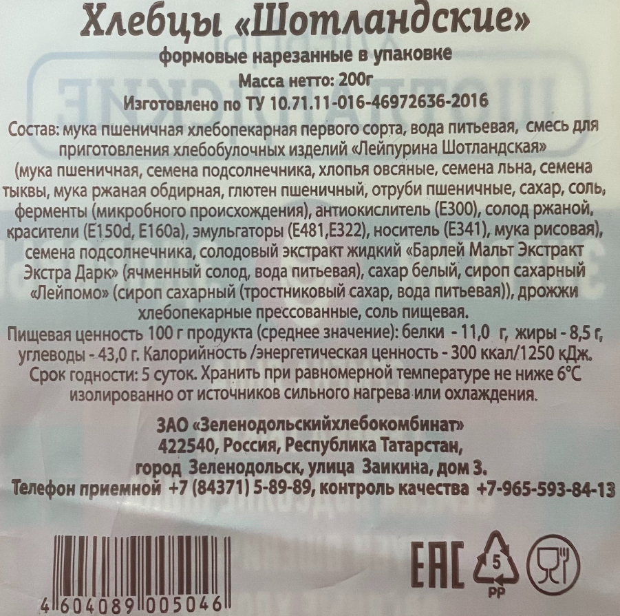 Мука пшеничная хлебопекарная первого сорта, вода питьевая, смесь для приготовления хлебобулочных изделий Лейпурина Шотландская мука пшеничная, семена подсолнечника, хлопья овсяные, семена льна, семена тыквы, мука ржаная обдирная, глютен пшеничный, отруби пшеничные, сахар, соль, ферменты микробного происхождения, антиокислитель Е300, солод ржаной, красители Е150d, E160a, эмульгаторы Е481,Е322, носитель Е341, мука рисовая, семена подсолнечника, солодовый экстракт жидкий Барлей Мальт Экстракт Экстра Дарк ячменный солод, вода питьевая, сахар белый, сироп сахарный Лейпомо сироп сахарный тростниковый сахар, вода питьевая, дрожжи хлебопекарные прессованные, соль пищевая.