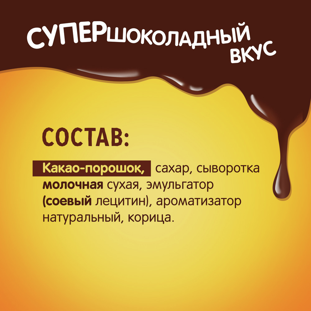 Какао-порошок, сахар, сыворотка молочная сухая, эмульгатор соевый лецитин, ароматизатор натуральный, корица.