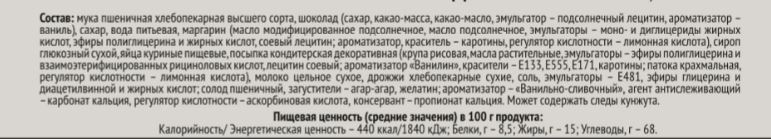 Мука пшеничная хлебопекарная высшего сорта, шоколад (сахар, какао-масса, какао-масло, эмульгатор – подсолнечный лецитин, ароматизатор – ваниль), сахар, вода питьевая, маргарин (масло модифицированное подсолнечное, масло подсолнечное, эмульгаторы – моно- и диглицериды жирных кислот, эфиры полиглицерина и жирных кислот, соевый лецитин; ароматизатор, краситель – каротины, регулятор кислотности – лимонная кислота), сироп глюкозный сухой, яйца куриные пищевые, посыпка кондитерская декоративная (крупа рисовая, масла растительные, эмульгаторы – эфиры полиглицерина и взаимоэтерифицированных рициноловых кислот, лецитин соевый; ароматизатор Ванилин, красители – Е133, Е555, Е171, каротины; патока крахмальная, регулятор кислотности – лимонная кислота), молоко цельное сухое, дрожжи хлебопекарные сухие, соль, эмульгаторы – Е481, эфиры глицерина и диацетилвинной и жирных кислот; солод пшеничный, загустители – агар-агар, желатин; ароматизатор – Ванильно-сливочный, агент антислеживающий – карбонат кальция, регулятор кислотности – аскорбиновая кислота, консервант – пропионат кальция. Может содержать следы кунжута.