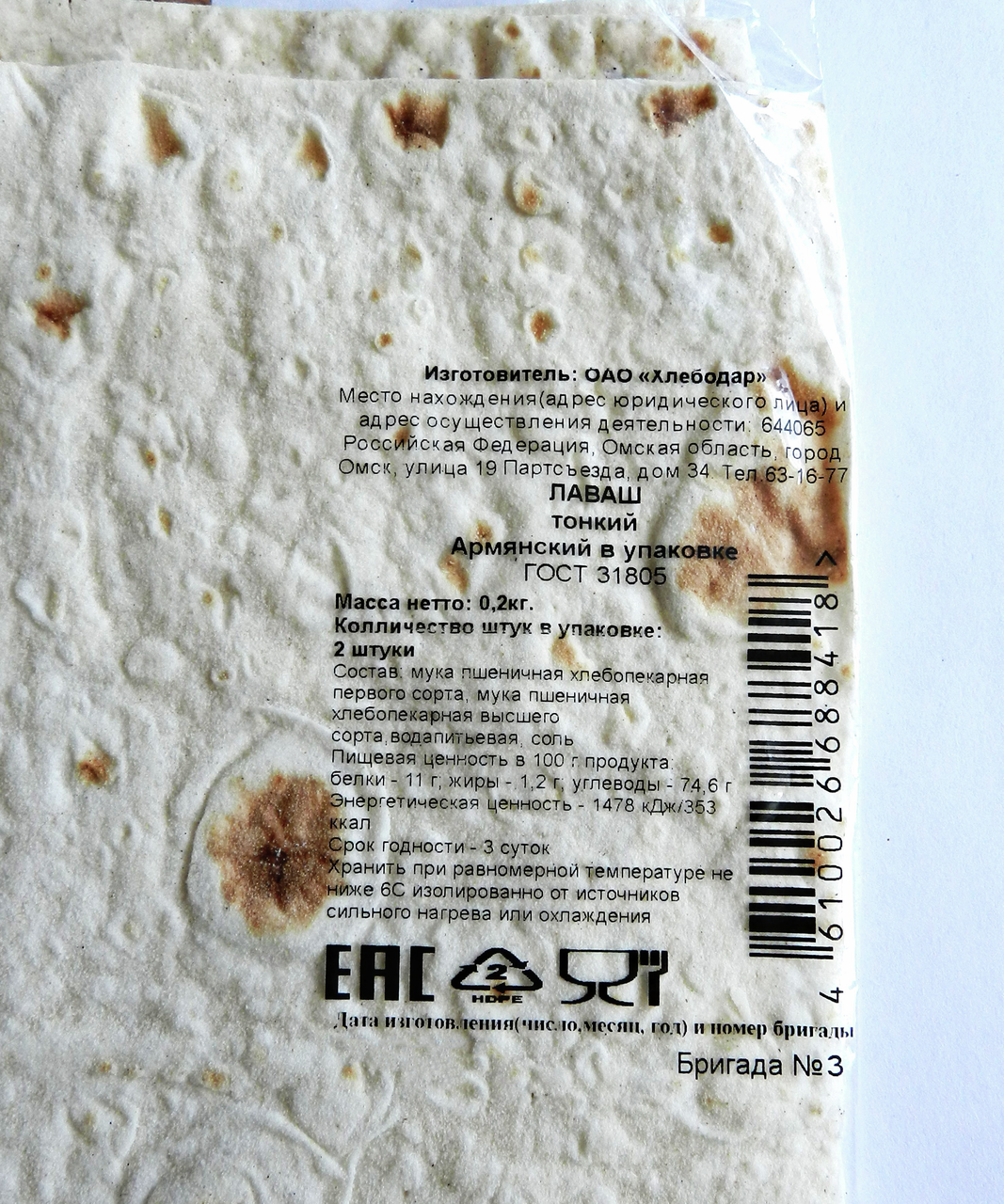 Лаваш армянский Хлебодар тонкий ГОСТ, 200г