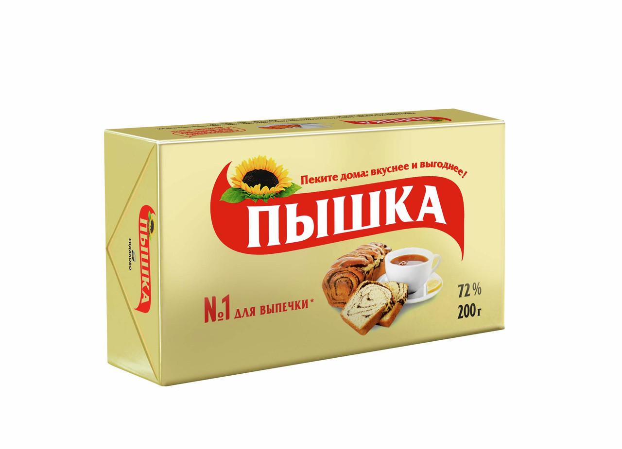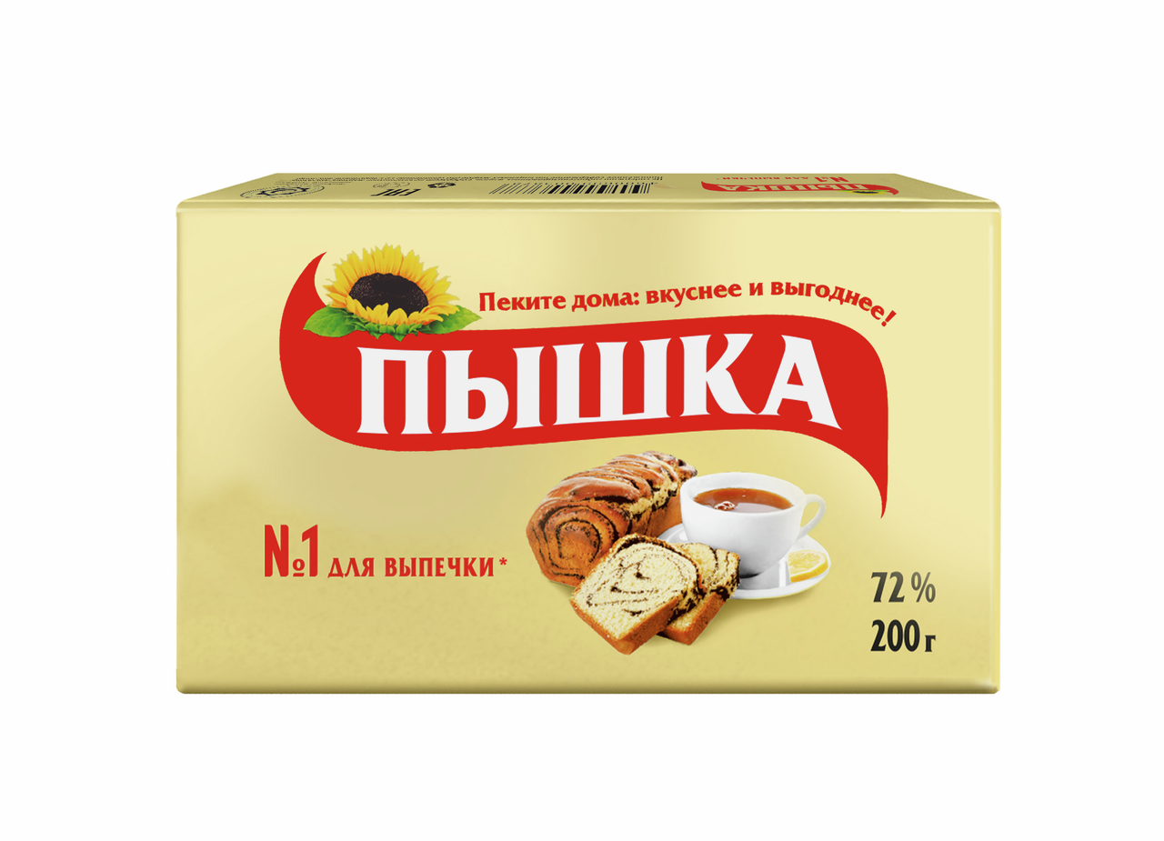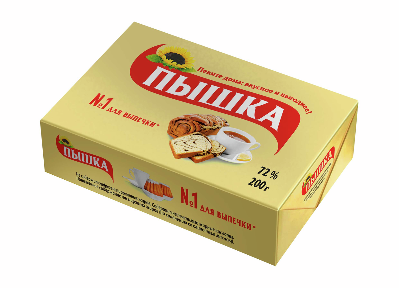 Пышка - маргарин 72% жирности, который предназначен специально для выпечки. Благодаря маргарину Пышка, каждая хозяйка может создавать на своей кухне настоящие кулинарные шедевры! Выпечка на основе Пышки равномерно поднимается и пропекается, структура получается нежной и пористой, бисквит упругим, пышным, таящим во рту с тонкой, хрустящей корочкой. Маргарин Пышка - настоящий эксперт в выпечке!