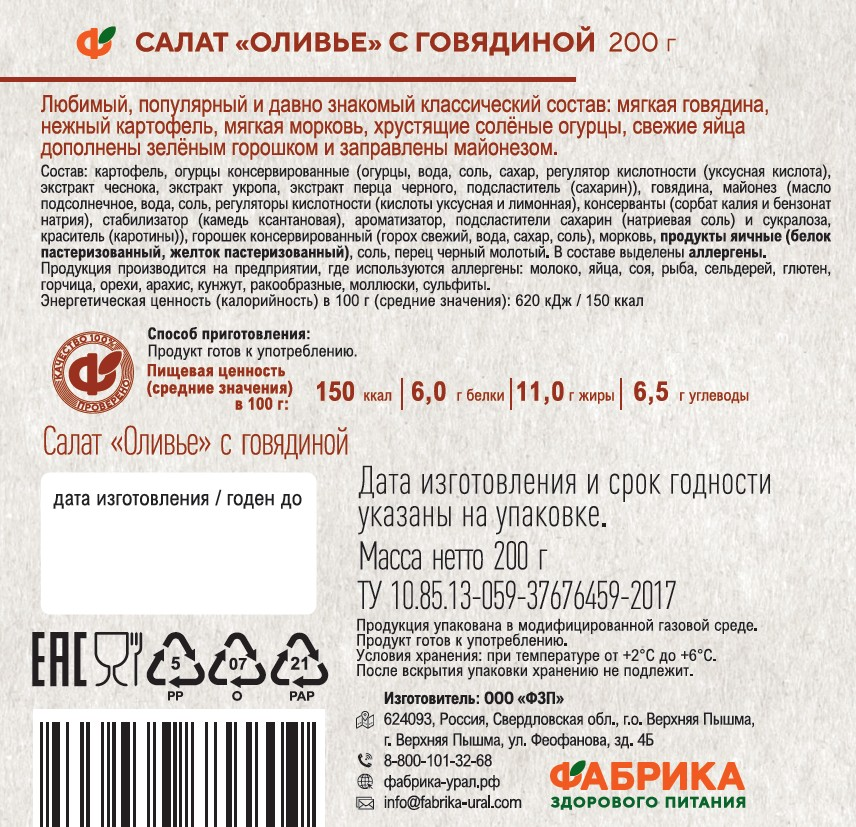 Салат Фабрика здорового питания Оливье с говядиной, 200г