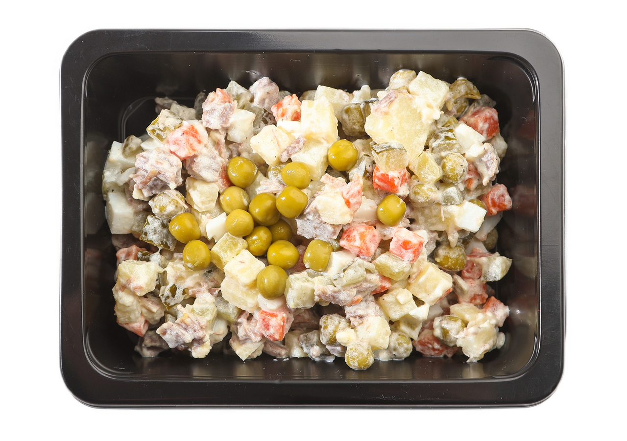 Картофель, огурцы консервированные (огурцы, вода, соль, сахар, регулятор кислотности (уксусная кислота), экстракт чеснока, экстракт укропа, экстракт перца черного, подсластитель (сахарин)), говядина, майонез (масло подсолнечное, вода, соль, регуляторы кислотности (кислоты уксусная и лимонная), консерванты (сорбат калия и бензоат натрия), стабилизатор (камедь ксантановая), ароматизатор, подсластители сахарин (натриевая соль) и сукралоза, краситель (каротины)), горошек консервированный (горох свежий, вода, сахар, соль), морковь, продукты яичные (белок пастеризованный, желток пастеризованный), соль, перец черный молотый.