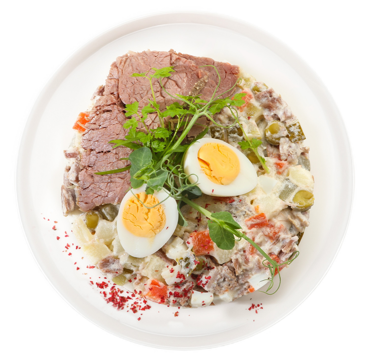 Популярный и давно знакомый классический состав: мягкая говядина, нежный картофель, мягкая морковь, хрустящие солёные огурцы, свежие яйца дополнены зелёным горошком и заправлены майонезом.