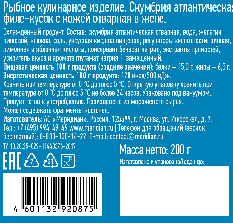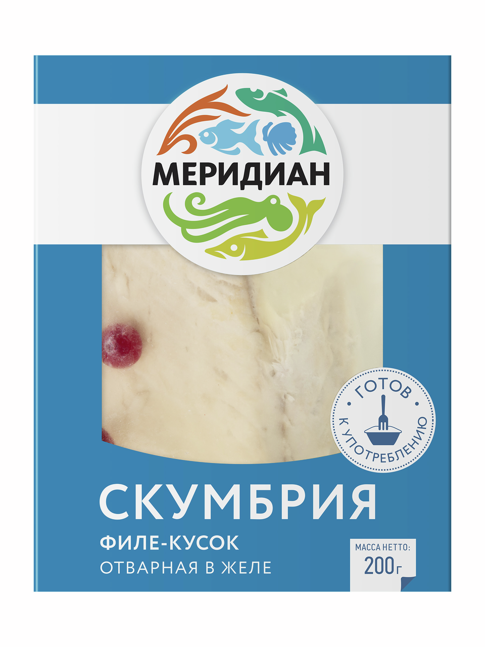 Скумбрия Меридиан отварная филе-кусок в желе, 200г