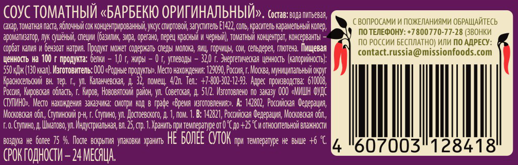 Вода, сахар, томатная паста, яблочный сок концентрированный, уксус спиртовой, загуститель Е1422, соль, краситель карамельный колер, ароматизатор, лук сушеный, специи (базилик, зира, орегано, перец красный и черный), томатный концентрат, консерванты – сорбат калия и бензоат натрия.