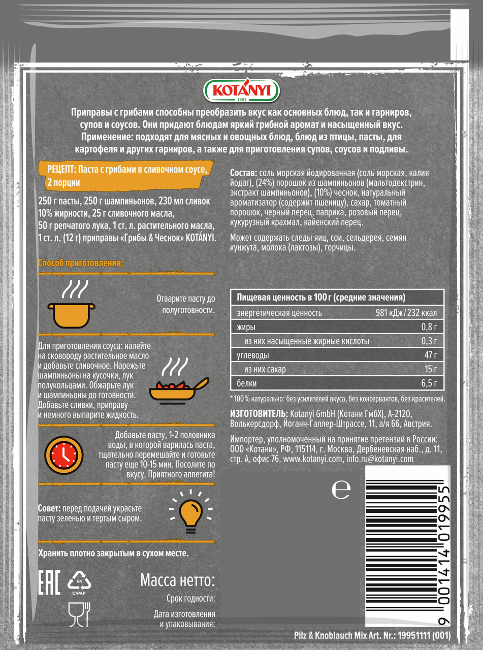 Соль морская йодированная (соль морская, калия йодат), 24% порошок из шампиньонов (мальтодекстрин, экстракт шампиньонов), 20% лук, натуральный ароматизатор (содержит пшеницу), сахар, куркума, черный перец, кориандр, кукурузный крахмал, мускатный орех, тмин.