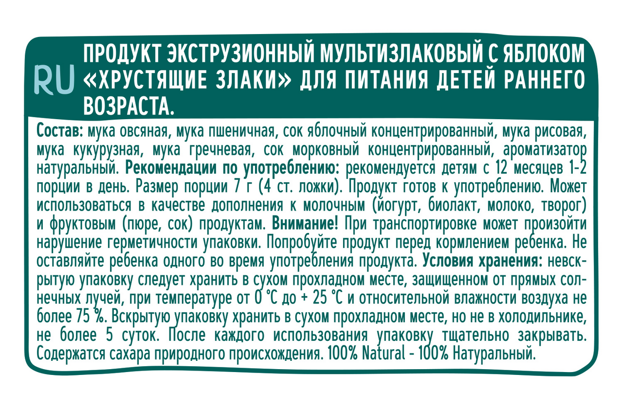 Мука овсяная, мука пшеничная, сок яблочный концентрированный, мука рисовая, мука кукурузная, мука гречневая, сок морковный концентрированный, ароматизатор натуральный.