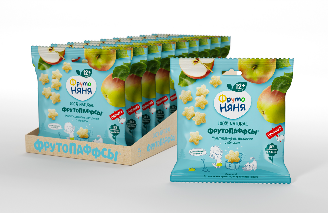 Звездочки ФрутоНяня Фрутопаффсы звездочки яблоко, 21 г представляет собой полезное лакомство для детей, которое приготовлено из натуральных ингредиентов высокого качества. Без добавления сахара, ГМО и других вредных компонентов. Продукт отличается нежным, ярко выраженным вкусом, хрустящей структурой и приятным ароматом. Форма угощения – удобная для маленьких рук малыша и помогает развивать мелкую моторику ребенка. Звездочки могут выступать в качестве быстрого перекуса. Они хорошо насыщают и быстро утоляют чувство голода. В основе лежит овсяная, пшеничная, рисовая, гречневая, кукурузная мука, яблочный и морковный сок. Лакомство можно употреблять детям с 12 месяцев по 1-2 порции (весом 7 г) в день. Его можно использовать как дополнение к молочной продукции – йогурту, молоку, творогу или пюре из фруктов, сокам. Выпускается в плотной упаковке небольшого размера, который надежно защищает содержимое. Пакет удобно брать с собой на прогулки и путешествия.