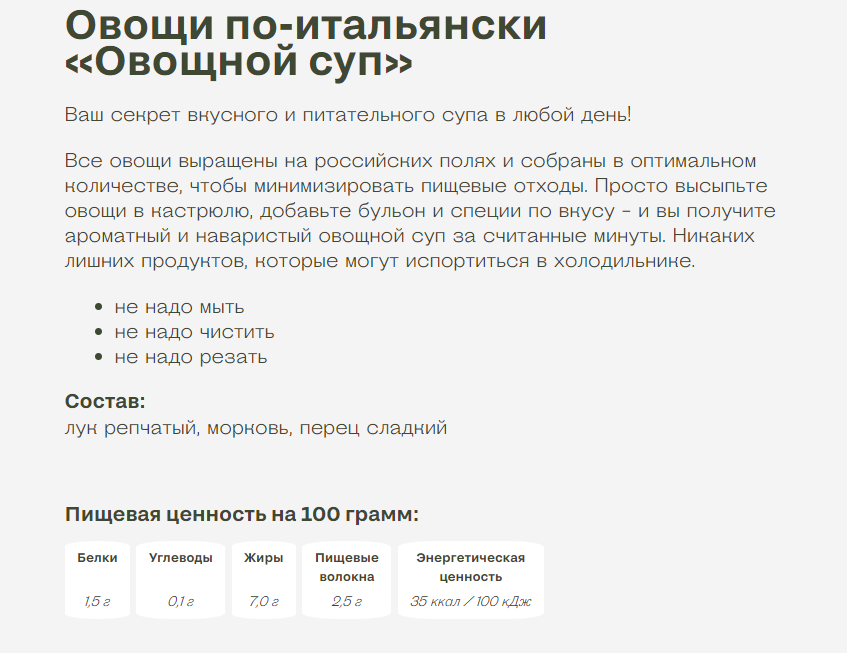 Овощной суп - набор нарезанных овощей для вегетарианского легкого супа от Белой Дачи. Этот практичный набор включает в себя тщательно отобранные и нарезанные овощи: сладкий перец, морковь и репчатый лук. Все овощи выращены на российских полях и собраны в оптимальном количестве, чтобы минимизировать пищевые отходы. Просто высыпьте овощи в кастрюлю, добавьте бульон и специи по вкусу - и вы получите ароматный и наваристый овощной суп за считанные минуты. Никаких лишних продуктов, которые могут испортиться в холодильнике - только свежие овощи, готовые к использованию.