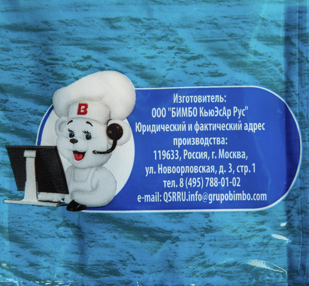 Мука пшеничная хлебопекарная высший сорт, вода питьевая, агент влагоудерживающий глицерин, смесь сухая для приготовления хлебобулочных изделий (мука пшеничная высший сорт, консерванты (Е262i, Е202), стабилизаторы (Е466, Е412, Е415), эмульгатор Е471, пищевые волокна, краситель Е171), масло пальмовое рафинированное дезодорированное, масло подсолнечное рафинированное дезодорированное, эмульгатор Е471, соль, улучшитель хлебопекарный (разрыхлители (Е500ii, Е450i, Е450), крахмал пшеничный, вещество для обработки муки - сульфат кальция, агент антислеживающий - диоксид кремния), сахар, регулятор кислотности - яблочная кислота, консервант - пропионат кальция, антиокислитель - метабисульфит натрия.