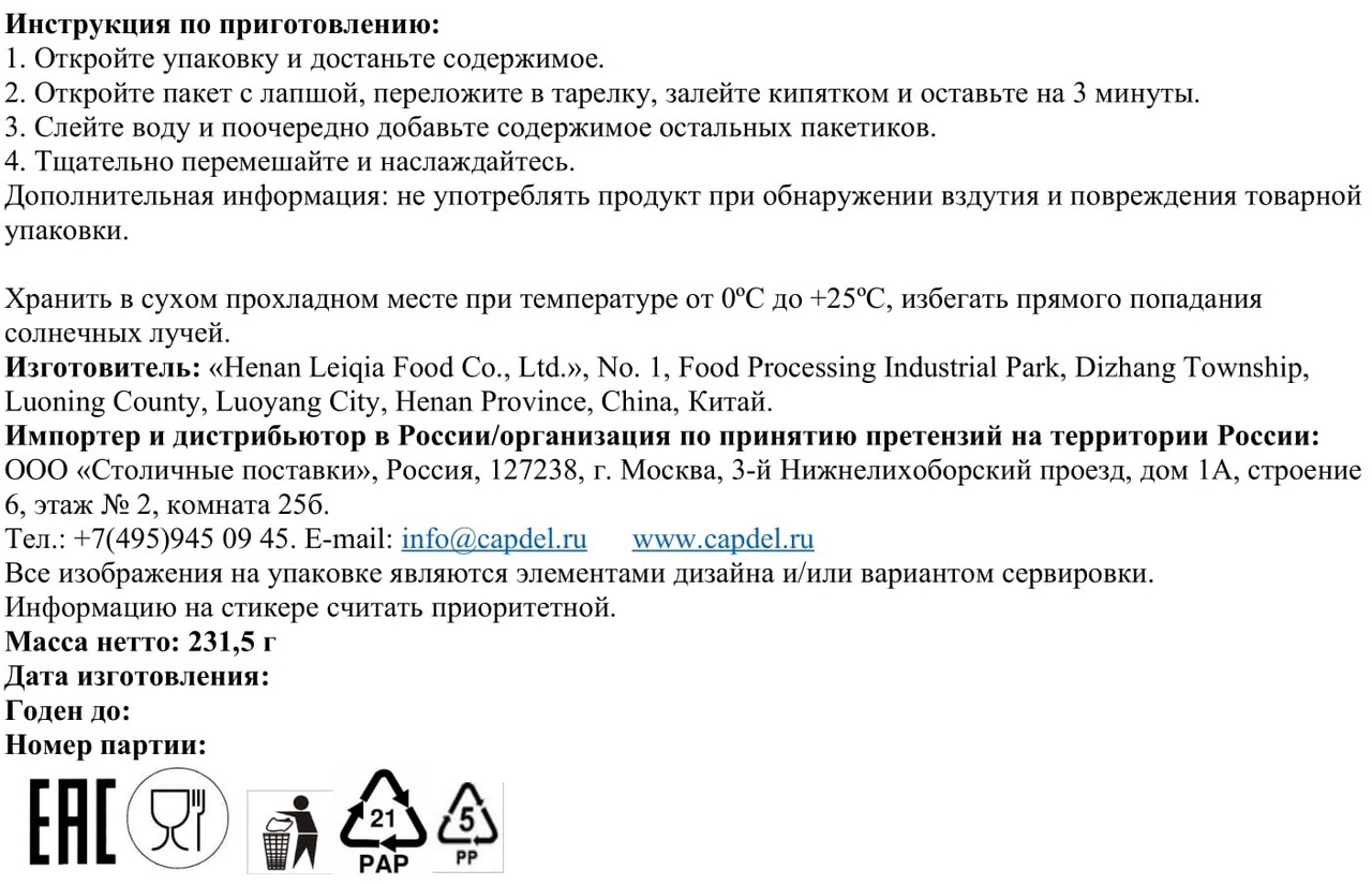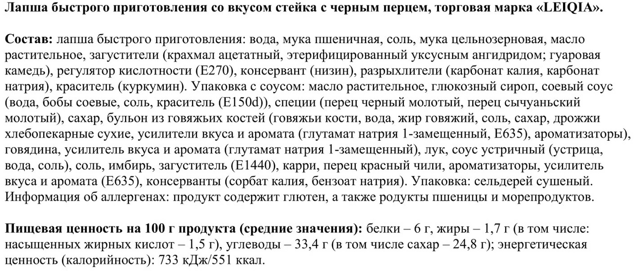 Лапша быстрого приготовления: вода, мука пшеничная, соль, мука цельнозерновая, масло растительное, загустители (крахмал ацетатный, этерифицированный уксусным ангидридом, гуаровая камедь), регулятор кислотности (Е270), консервант (низин), разрыхлители (карбонат калия, карбонат натрия), краситель (куркумин). Упаковка с соусом: масло растительное, глюкозный сироп, соевый соус (вода, бобы соевые, соль, краситель (E150d)), специи (перец черный молотый, перец сычуаньский молотый), сахар, бульон из говяжьих костей (говяжьи кости, вода, жир говяжий, соль, сахар, дрожжи хлебопекарные сухие, усилители вкуса и аромата (глутамат натрия 1-замещенный, Е635), ароматизаторы), говядина, усилитель вкуса и аромата (глутамат натрия 1-замещенный), лук, соус устричный (устрица, вода, соль), соль, имбирь, загуститель (Е1440), карри, перец красный чили, ароматизаторы, усилитель вкуса и аромата (Е635), консерванты (сорбат калия, бензоат натрия). Упаковка: сельдерей сушеный.