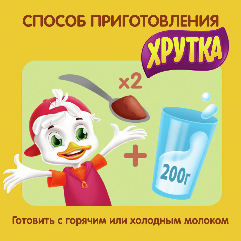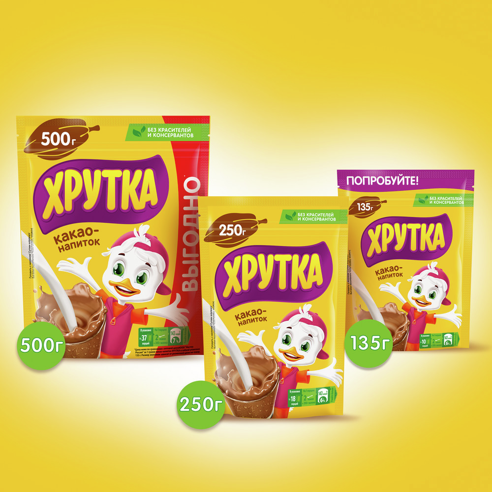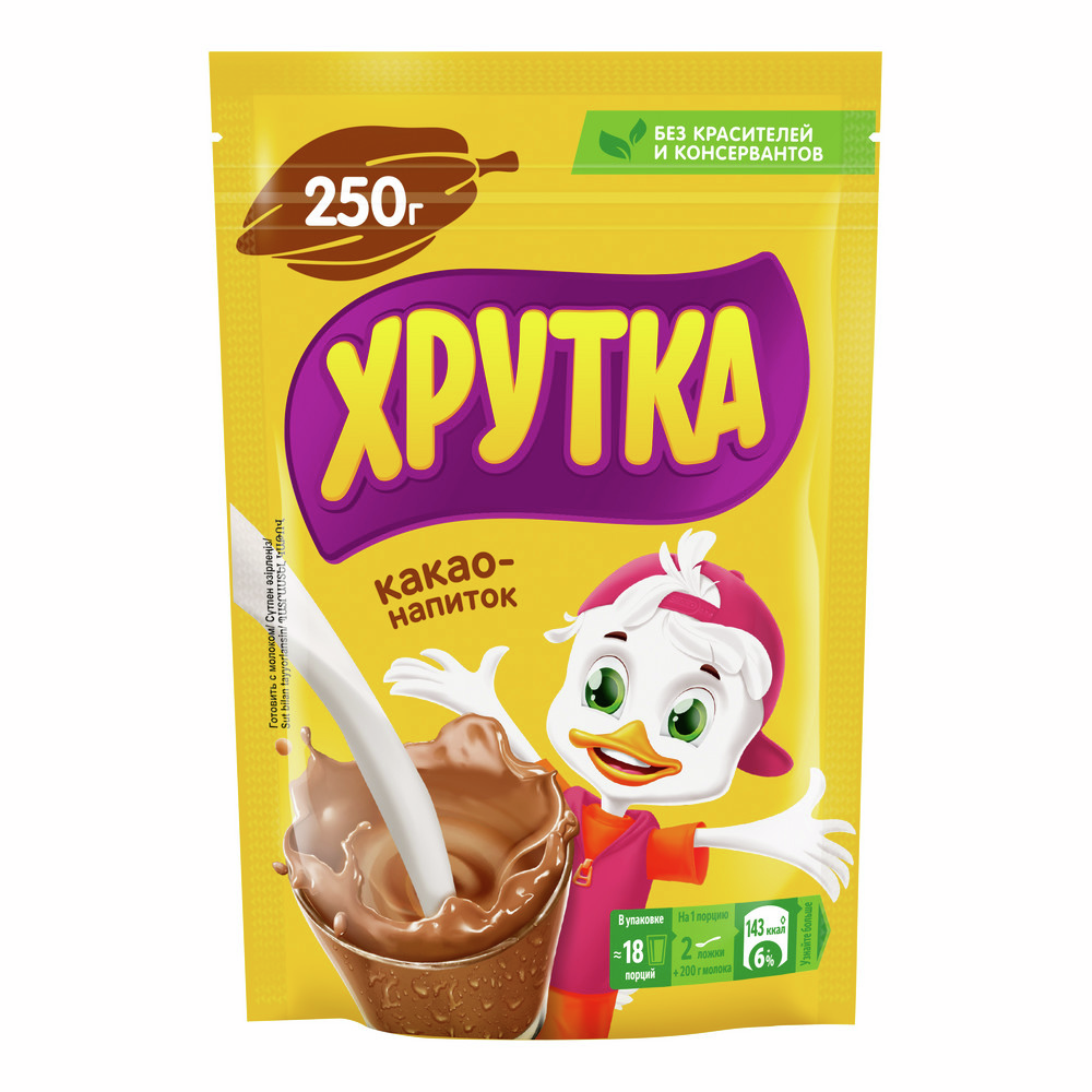 Отлично подойдет для завтрака или полдника. Производится из высококачественных ингредиентов без использования красителей и консервантов. Готовится за считанные секунды: просто добавьте 2 чайные ложки какао в стакан молока, перемешайте и наслаждайтесь вкусным и питательным напитком. Какао-порошок служит ценным источником магния, железа и фосфора, а молоко обогащает организм кальцием, необходимым для укрепления зубов и костей. Таким образом, напиток является еще и полезным для здоровья, а самое главное – детям очень нравится его нежный вкус и приятный аромат. Кстати, если Хрутку смешать с холодным молоком, то получится освежающий шоколадный коктейль. Удобная упаковка имеет многоразовую zip-застежку.
