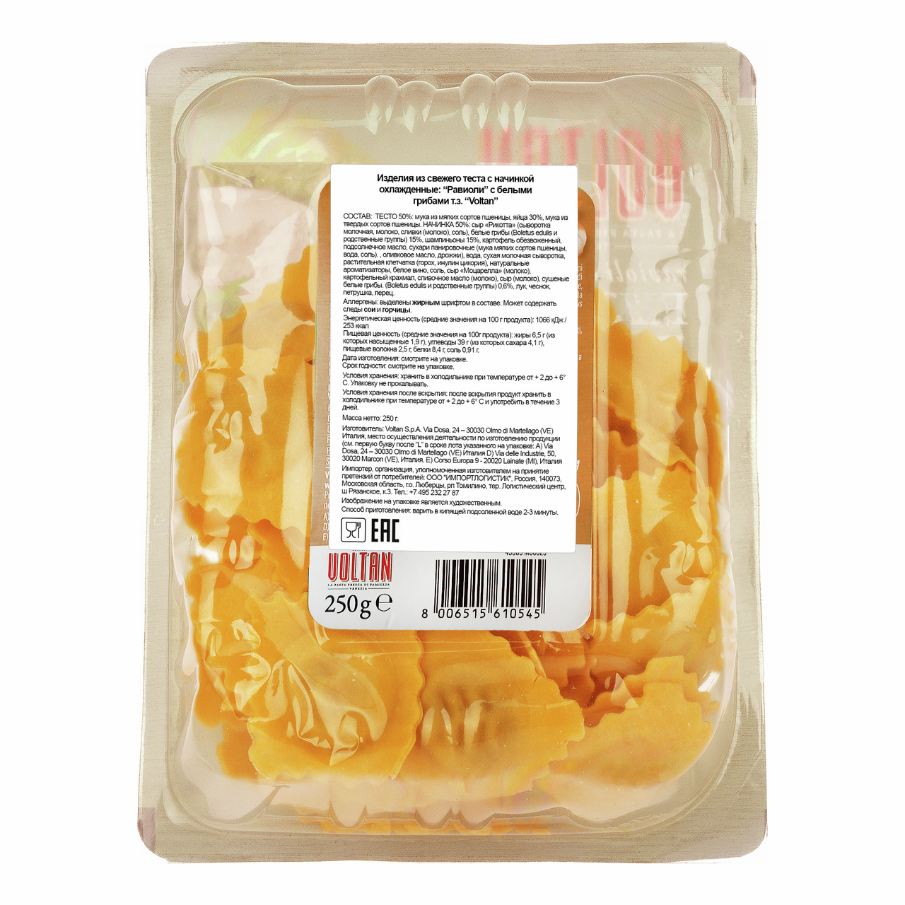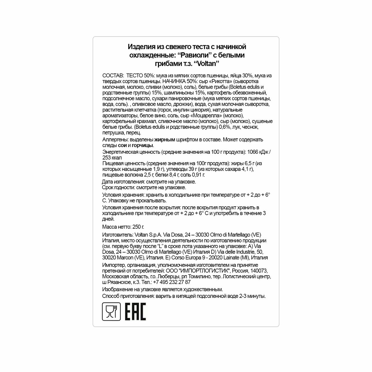 Тесто 50%: мука из мягких сортов пшеницы, яйца 30%, мука из твердых сортов пшеницы. Начинка 50%: сыр Рикотта (сыворотка молочная, молоко, сливки (молоко), соль), белые грибы (Boletus edulis и родственные группы) 15%, шампиньоны 15%, картофель обезвоженный, подсолнечное масло, сухари панировочные (мука мягких сортов пшеницы, вода, соль, оливковое масло, дрожжи), вода, сухая молочная сыворотка, растительная клетчатка (горох, инулин цикория), натуральные ароматизаторы, белое вино, соль, сыр Моцарелла (молоко), картофельный крахмал, сливочное масло (молоко), сыр (молоко), сушеные белые грибы. (Boletus edulis и родственные группы) 0,6%, лук, чеснок, петрушка, перец. Может содержать следы сои и горчицы.