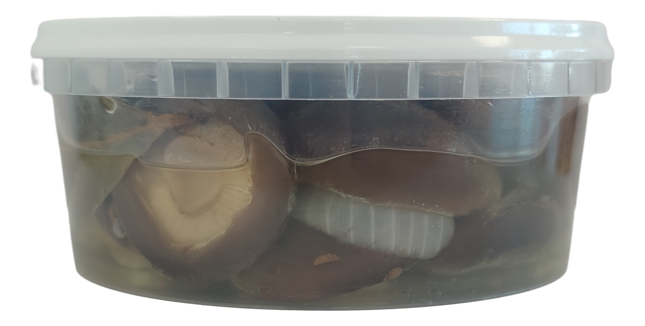 Охлажденный грибной салатик, обладающий оригинальным, слегка пикантным вкусом. Его готовят из отборных грибов шиитаке с добавлением репчатого лука, чеснока, специй, пряностей и прочих ингредиентов. Шиитаке – это деликатесные азиатские грибы, богатые калием, медью, фосфором, селеном, витаминами (А, D, В2, В5, В6, РР), клетчаткой и аминокислотами. При регулярном употреблении они помогут снизить уровень вредного холестерина, поспособствуют укреплению иммунитета, очистят кишечник от токсинов, минимизируют риск развития атеросклероза.