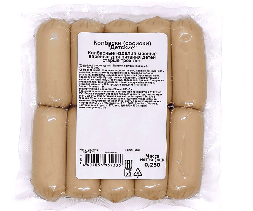 Рецептура колбасок разработана специально для питания детей от 3-х лет. Они изготавливаются из свежей говядины и свинины с добавлением небольшого количества соли, душистого перца и мускатного ореха. Предназначены специально для питания детей дошкольного и школьного возраста, изготавливаются по Государственному стандарту.