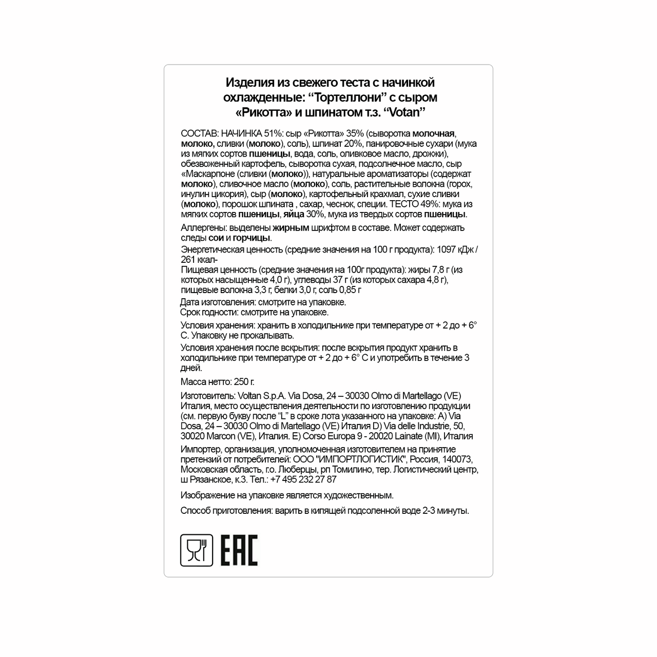Тортеллони Voltan сыр рикотта-шпинат, 250г