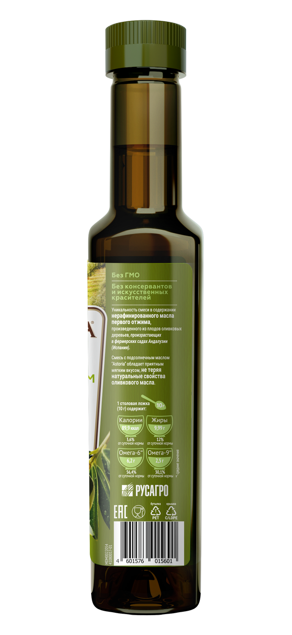 Уникальность смеси в содержании нерафинированного масла первого отжима, произведённого из плодов оливковых деревьев, произрастающих в фермерских садах Андалузии (Испания). Смесь с подсолнечным маслом Astoria обладает приятным мягким вкусом, не теряя натуральные свойства оливкового масла.