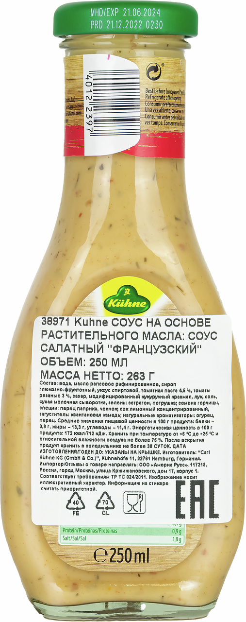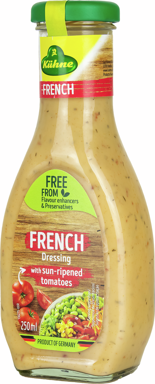 Соус салатный Французский от известного немецкого бренда Kuhne помогает подчеркнуть восхитительный вкус блюда. Этот продукт с добавлением типичной для французской кухни зелени и томатного пюре идеально подходит как для зелёных листовых, так и овощных салатов с добавлением мяса, рыбы и морепродуктов.