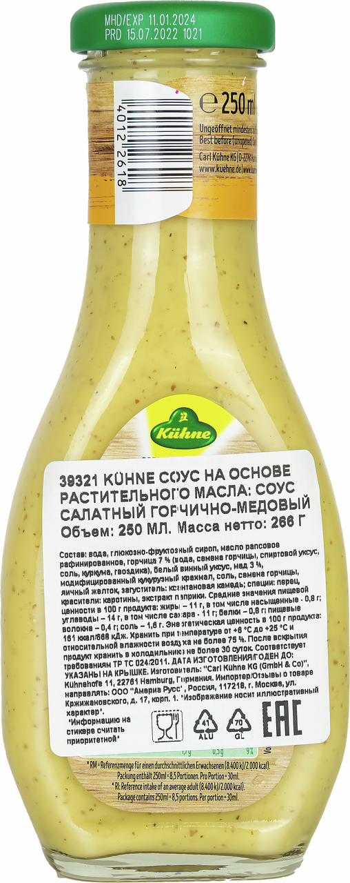 Соус Kuhne салатный горчично-медовый, 250 мл популярен во всем мире за счет мягкого, сладкого вкуса. Приправа обладает сливочной консистенцией, умеренными пикантностью и сладостью, поэтому ее часто используют в качестве соуса, заправки для салатов, вторых блюд, холодных закусок. В кулинарии она становится отличной приправой к мясу, колбаскам и холодцу. Насыщенный палево-желтый цвет обусловлен особым видом семян. Продукт богат белками, крахмалом и органическими кислотами. В нем содержится большой процент витаминов группы B, А, Е, D, а также магний, цинк, фосфор, укрепляющие сердечно-сосудистую систему. Также он нормализует уровень холестерина в крови, помогает при простуде и воспалительных процессах. Условия хранения: хранить при температуре от +6С до +25С и относительной влажности воздуха не более 75%.
