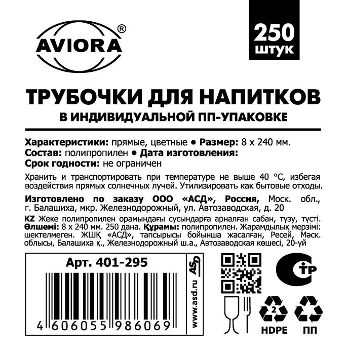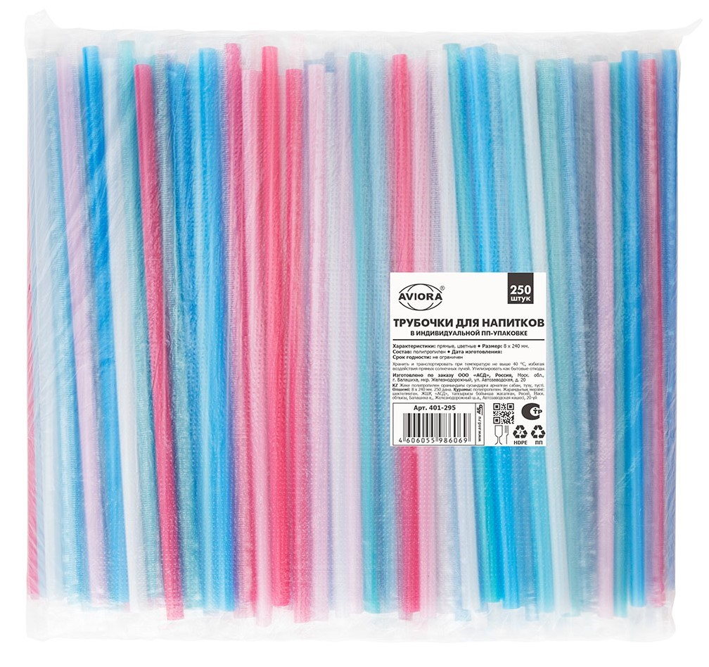 Трубочки для коктейля Aviora цветные в индивидуальной упаковке 8мм 24см, 250шт
