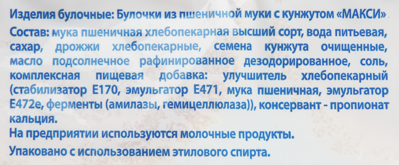 Мука пшеничная хлебопекарная высший сорт, вода питьевая, сахар, дрожжи хлебопекарные, семена кунжута очищенные, масло подсолнечное рафинированное дезодорированное, соль, комплексная пищевая добавка: улучшитель хлебопекарный стабилизатор Е170, эмульгатор Е471, мука пшеничная, эмульгатор Е472е, ферменты амилазы, гемицеллюлаза, консервант - пропионат кальция.