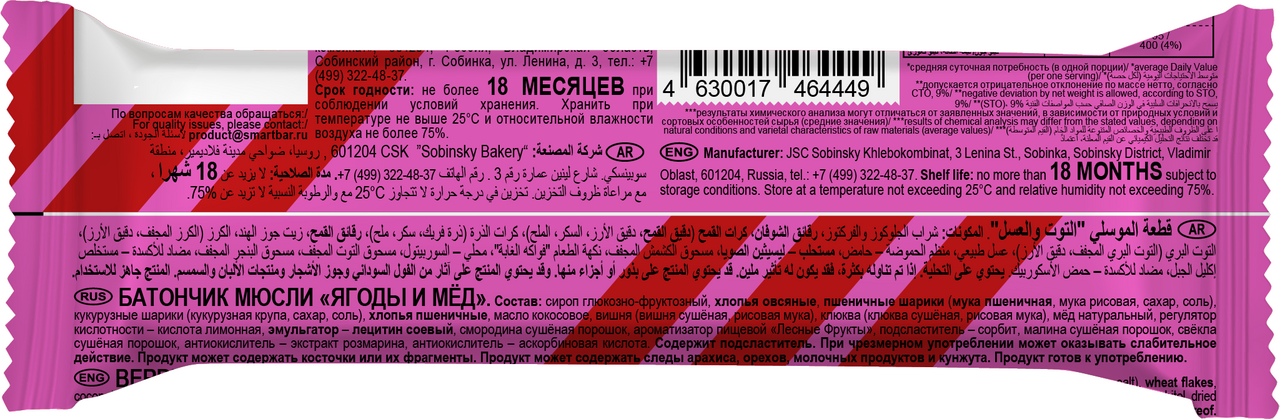 Хлопья овсяные и пшеничные, сироп глюкозно-фруктозный, рис воздушный (рисовая мука, пшеничная мука, соль), хлопья кукурузные (кукурузная крупа, соль), масло кокосовое, мёд, вишня сушёная, клюква сушёная, эмульгатор – лецитин подсолнечный, смородина сушёная порошок, малина сушёная порошок, регулятор кислотности - кислота лимонная, ароматизатор Лесные Фрукты, подсластитель - сорбит.